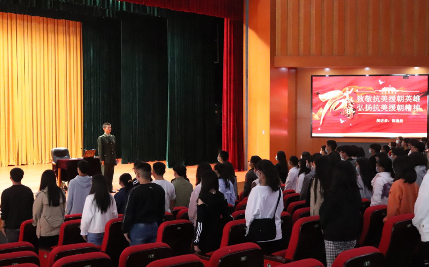 活动在庄严的国歌声中拉开序幕。“国防后备连”合唱《中国军魂》,活动讲述了抗美援朝战争中的长津湖战役、上甘岭战役和革命先辈们的英雄事迹,播放了“冰雕连”电影片段和迎接中国人民志愿军烈士遗骸回国的视频,会场全体人员起立,向抗美援朝志愿军将士们致敬;活动同时还组织开展《中国人民人民共和国兵役法》知识培训,为同学们详细解读兵役政策,我校退役大学生们分享了各自的军旅生涯,还表演了丰富多彩的文艺节目。