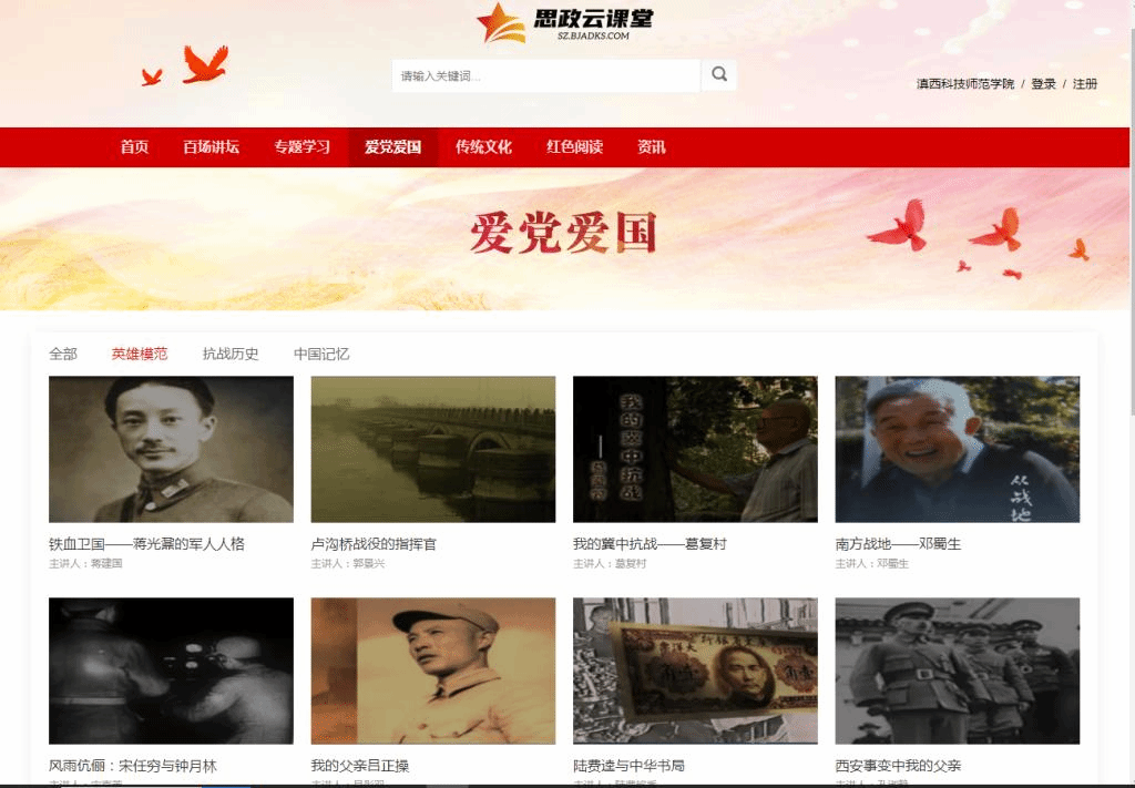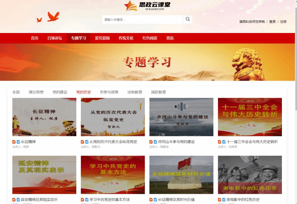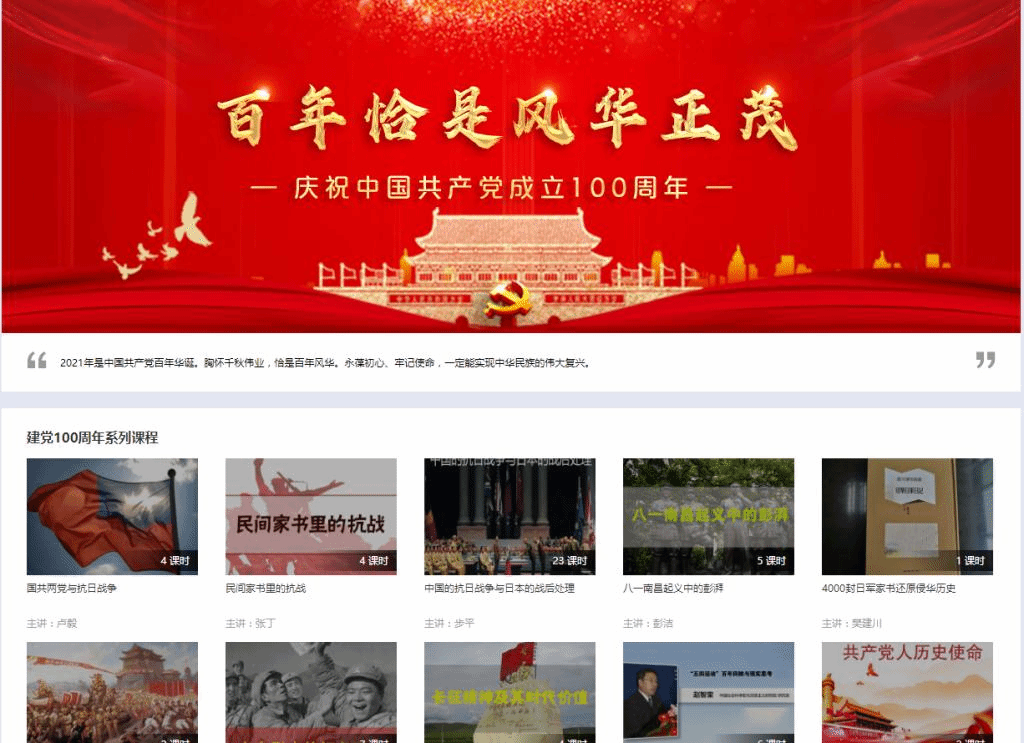 1.《网上报告厅——建党100周年专题》,http://h5.cdn.bjadks.com/website/wsbgt-zt/32-dzzn/index.html;是以综合素质培养为设计理念,成为集素质培养教育视频资源、多功能学习中心、多层次互动空间、个性化系统管理、特色资源共建系统等全面的学习与管理功能为一体的在线学习平台。内容包括:理工系列,经管系列,文史系列,党政系列,外语学习,教育培训,医学系列,综合素质,就业择业,营销系列,心理健康,体育系列,法律视点,农林系列,对话,探索发现,军事系列,旅游地理等,球友会在线客服专题资源访问方式:www.wsbgt.com;