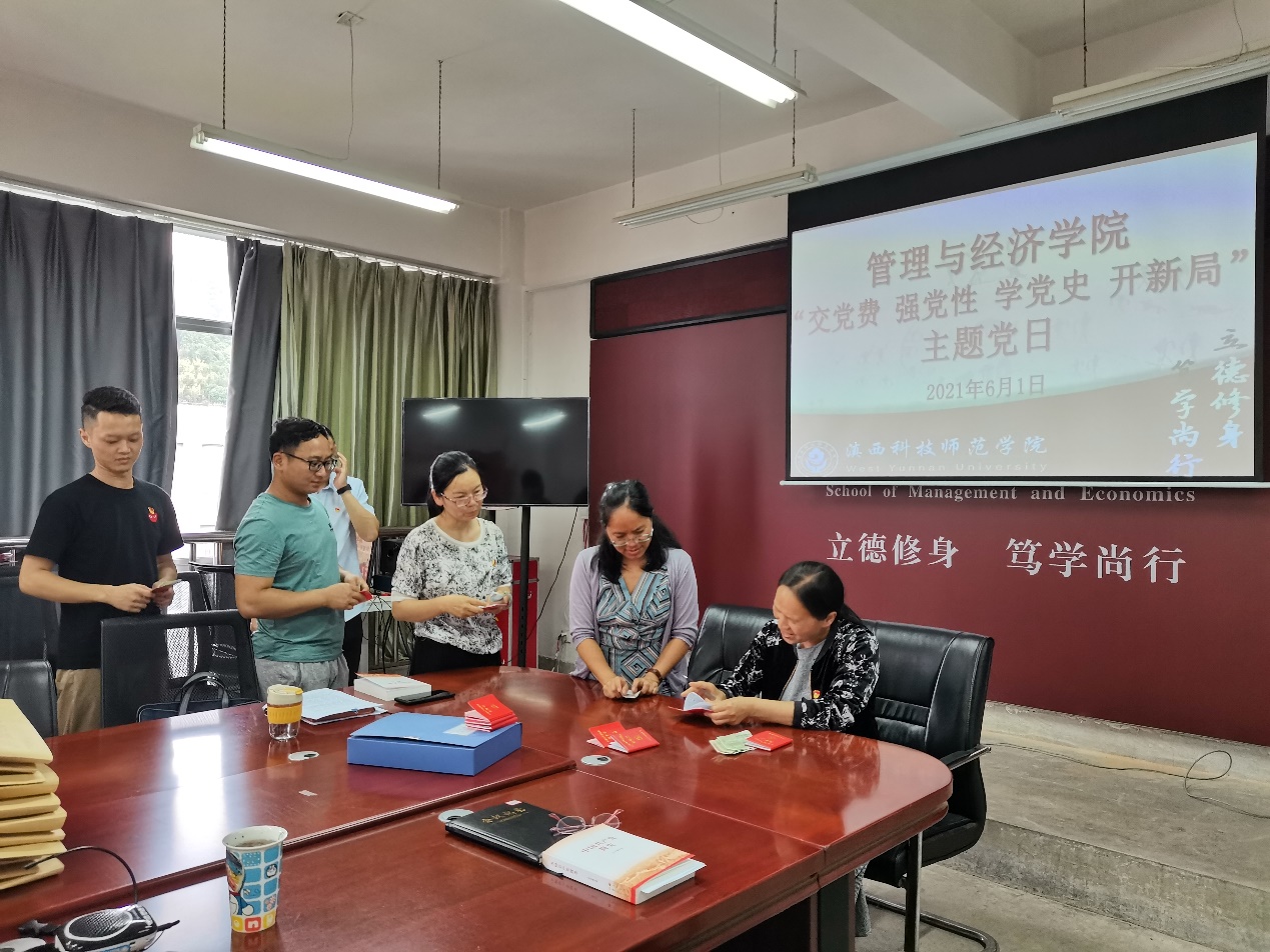 近日,为增强党员的党性观念和党员意识,管经学院党总支于组织学院师生党员在党员活动室开展“党费日”集中缴纳党费主题党日活动,组织党员同志们现场集中缴纳党费,并在每位党员的党费证上做好登记,让每一位党员同志感受缴纳党费的荣誉感和责任感。活动还组织学习了《中国共产党简史》第三章的内容和习近平总书记在两院院士大会中国科协第十次全国代表大会上的讲话精神。活动强调,各党支部要高度重视党史学习教育,强化组织领导,精心统筹谋划,高标准高质量完成学习教育各项任务,确保党史学习教育取得扎实成效。