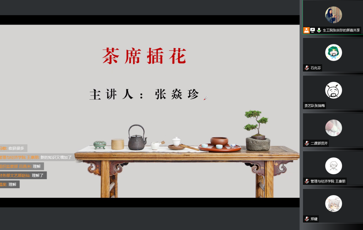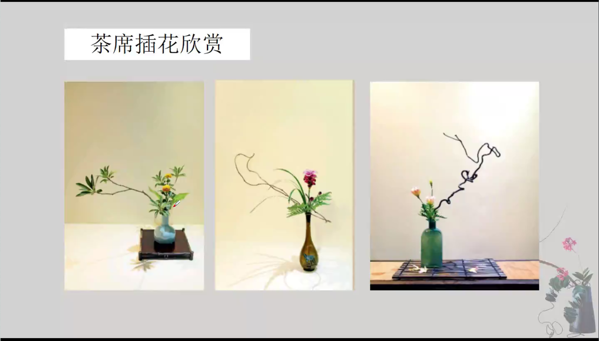 张焱珍副教授从茶席插花的概念、茶席插花的历史、茶席插花的基本花型及插法,茶席插花作品欣赏等方面进行讲解,向同学们展示了插花的独特魅力。