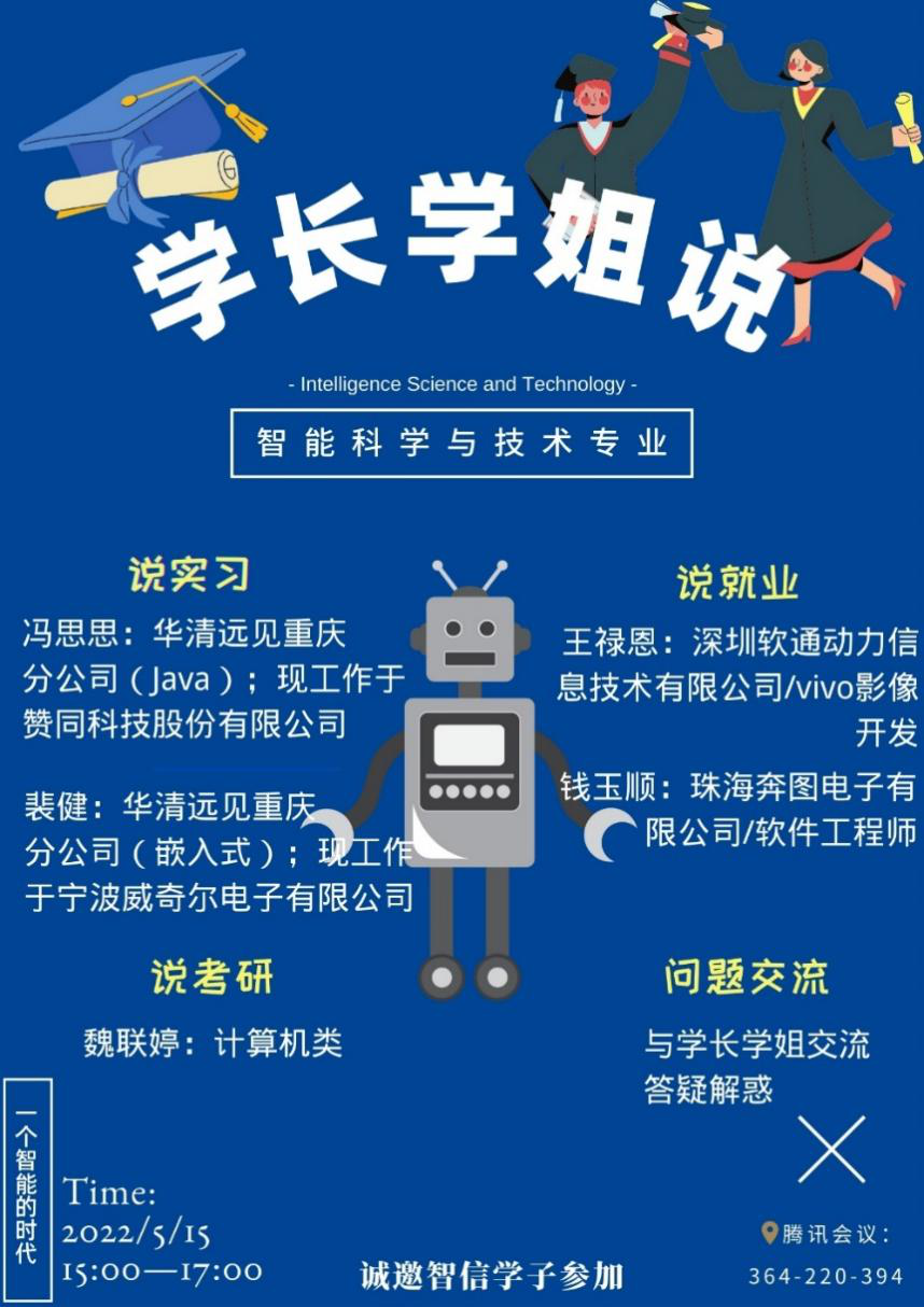 5月15日,智能与信息工程学院第2场“学长学姐说”活动在线上进行。交流活动邀请2018级智能科学与技术班的5位学长学姐与智能科学与技术专业各年级的广大同学进行分享交流。