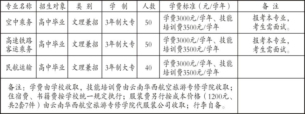 (四)需面试专业要求:五官端正、形象气质佳,身体裸露处无明显疤痕和纹身,腿型不能有内八字和外八字,双眼矫正视力不低于4.7E。报考空中乘务专业及高速铁路客运乘务专业的考生需在高考填报志愿前参加并通过面试,面试时间由学校招办通知,面试咨询邹老师,手机:13759353466。面试报到时需带身份证或户口本双面复印件两张及初高中毕业证和准考证。